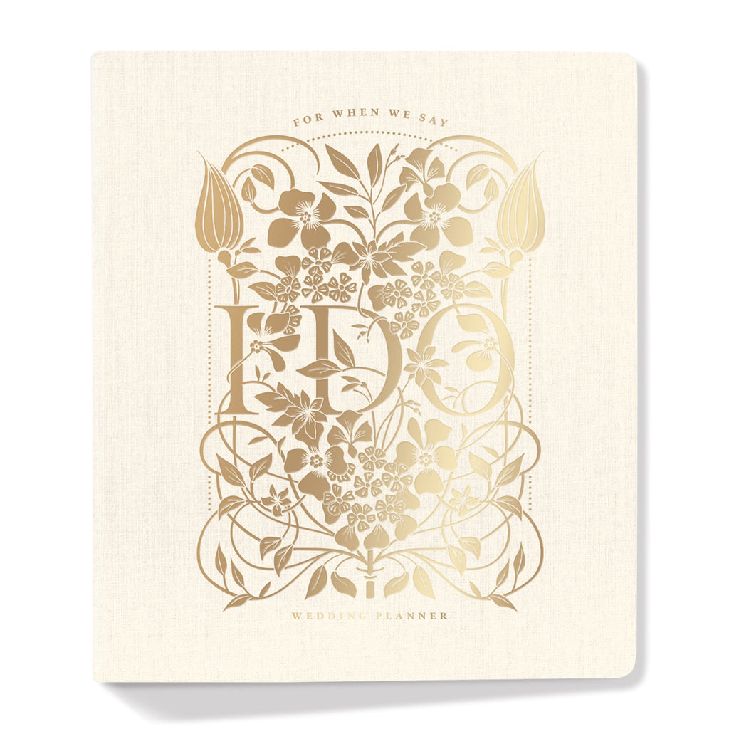 Wedding planner with hardcover wrapped in book cloth featuring Fringe original artwork with metallic gold foil design, 12 tabbed categories with gold foil accents, guided pages, a double-sided pocket, and concealed spiral binding.