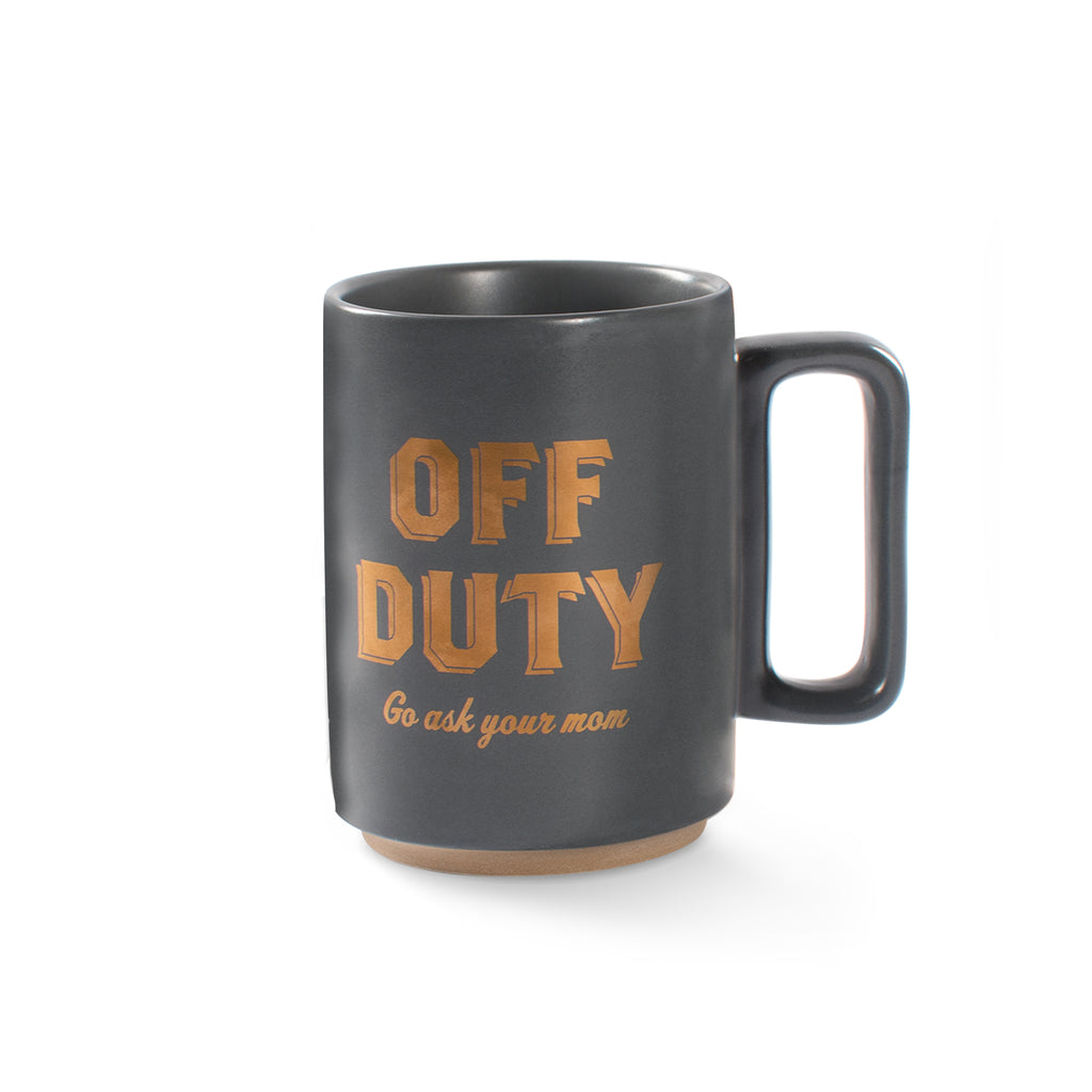 Ceramic mug featuring Fringe original artwork with metallic gold design, matte dark grey glaze, and exposed stoneware base.