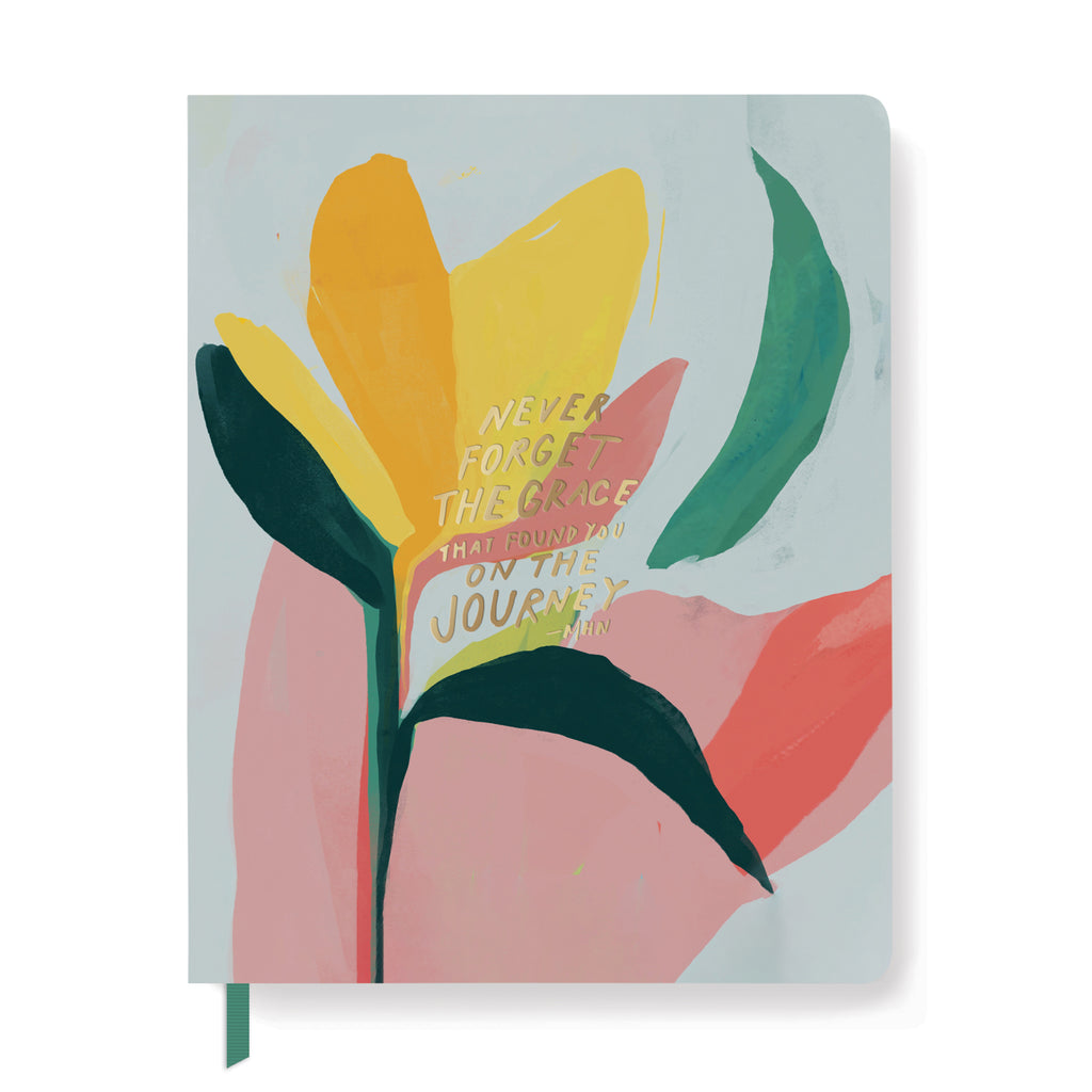 Inspirational message on journal cover: "Never forget the grace that found you on the journey"