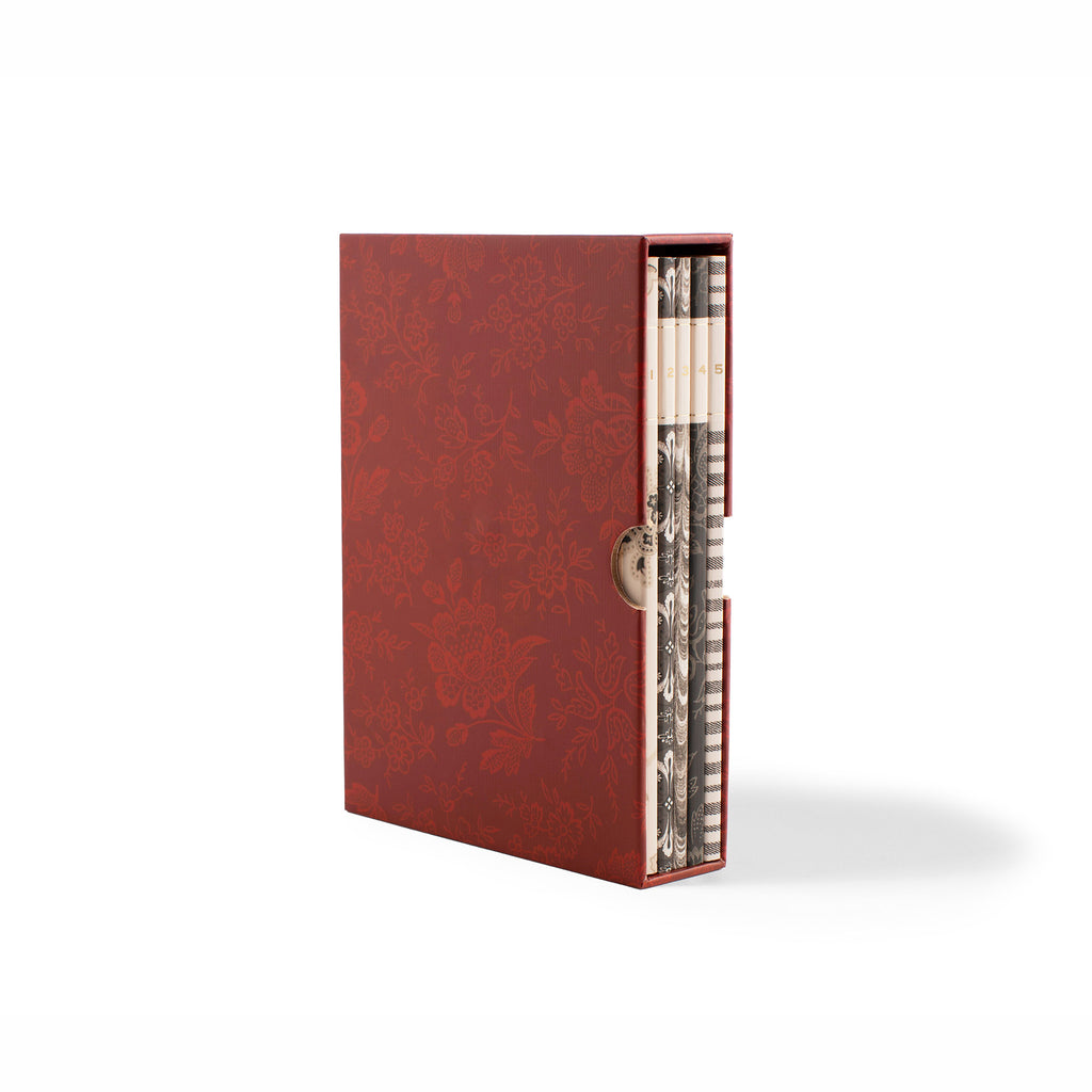 This set of 5 petite slim journals with textured paperback covers features unique Fringe original artwork on each cover and metallic gold foil accents. Journals are packaged in a textured paper wrapped box sleeve with unique art and an opening on one side to easily insert and remove journals.