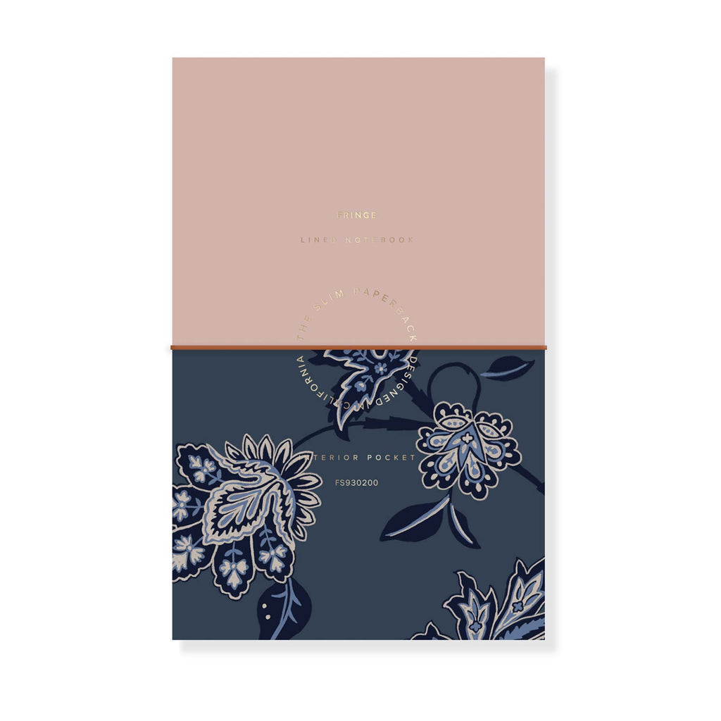 Slim paperback journal with flexible textured cover featuring Memento Found Artwork, elastic cord closure, metallic gold foil accent, folded front storage flap, and back pocket.