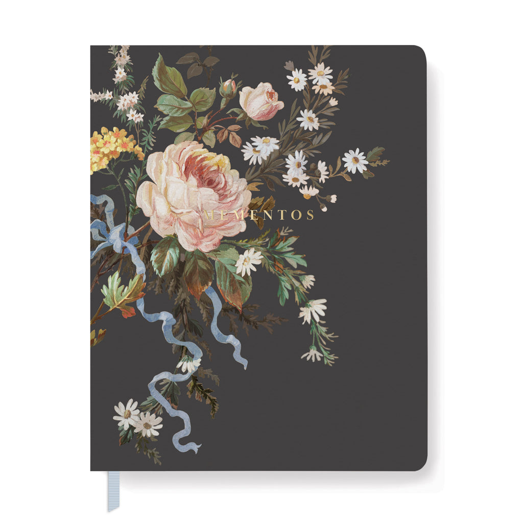 Large classic paperback journal with flexible textured cover featuring Memento Found Artwork, metallic gold foil accent, and ribbon bookmark.