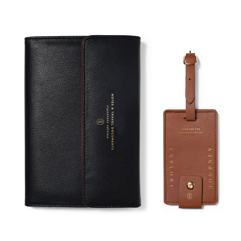 Keep travel essentials safe and document your days all in one place. This faux leather travel folio set includes a journal, metal ballpoint pen, and luggage tag.