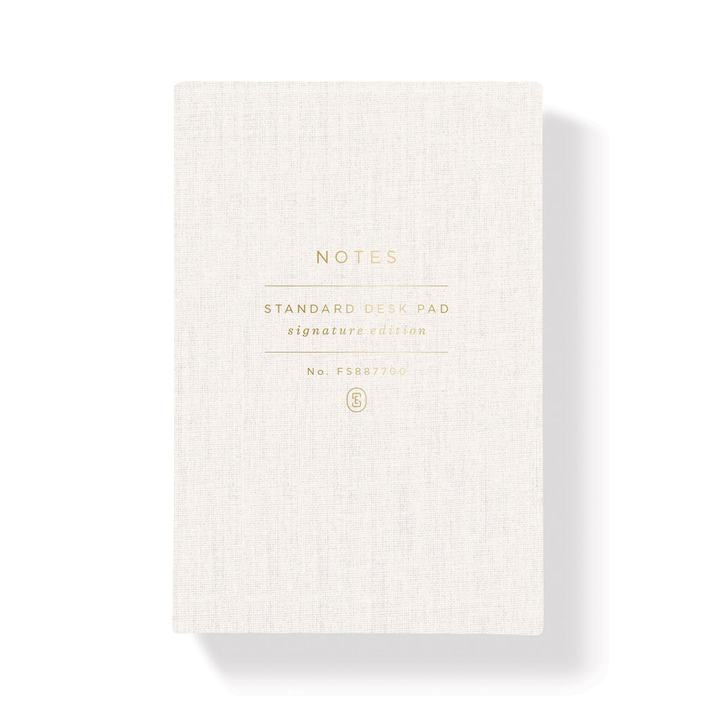 Desktop notepad with flexible hardcover wrapped in book cloth, featuring Fringe original artwork with metallic gold foil design and an easel flip cover.