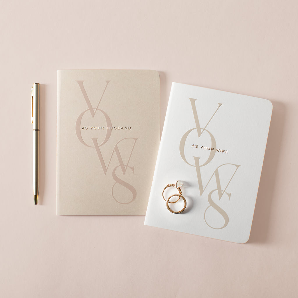 Set of 2 pocket-sized vow books with cotton textured paper covers featuring Fringe original artwork, metallic gold foil accents, and embossed designs.