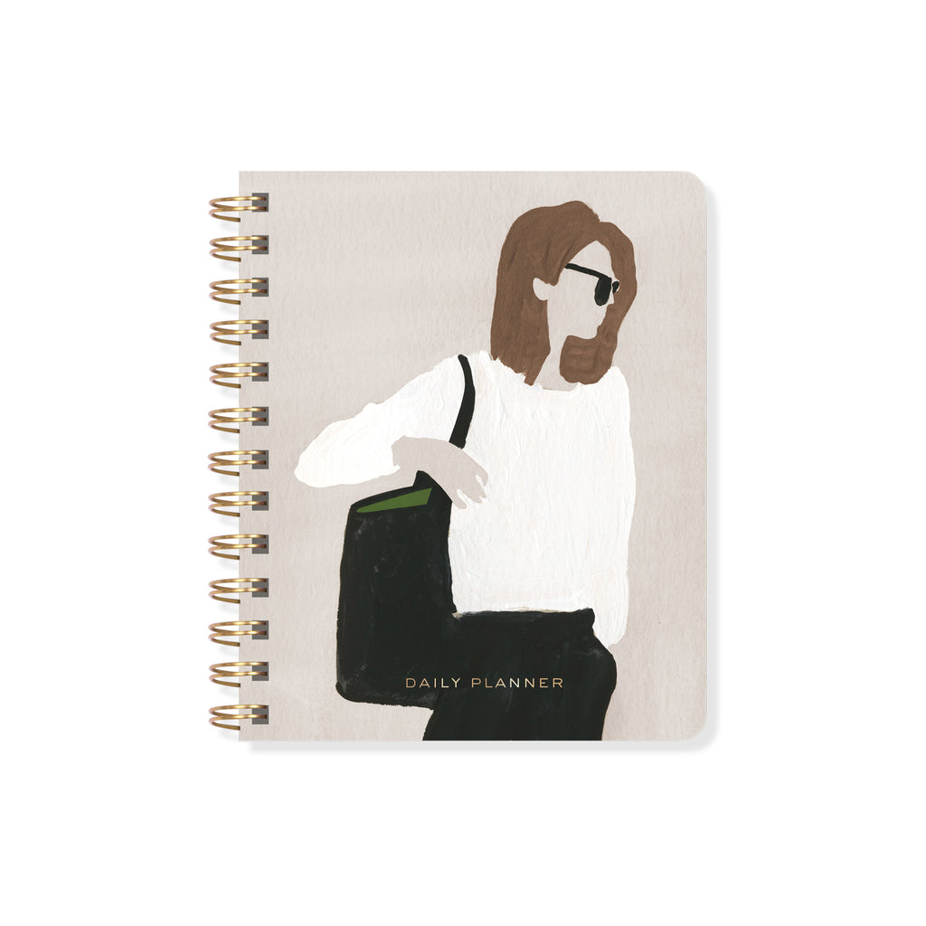 Non-dated daily planner with textured paper cover featuring exclusive artwork by Megan Galante, metallic gold foil accent, daily prompted interior pages, and twin-ring spiral binding.