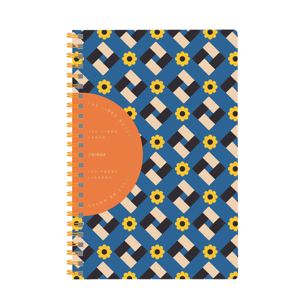 Slim journal with flexible paper cover featuring Fringe original artwork, colored edges, and colored twin-ring spiral binding.