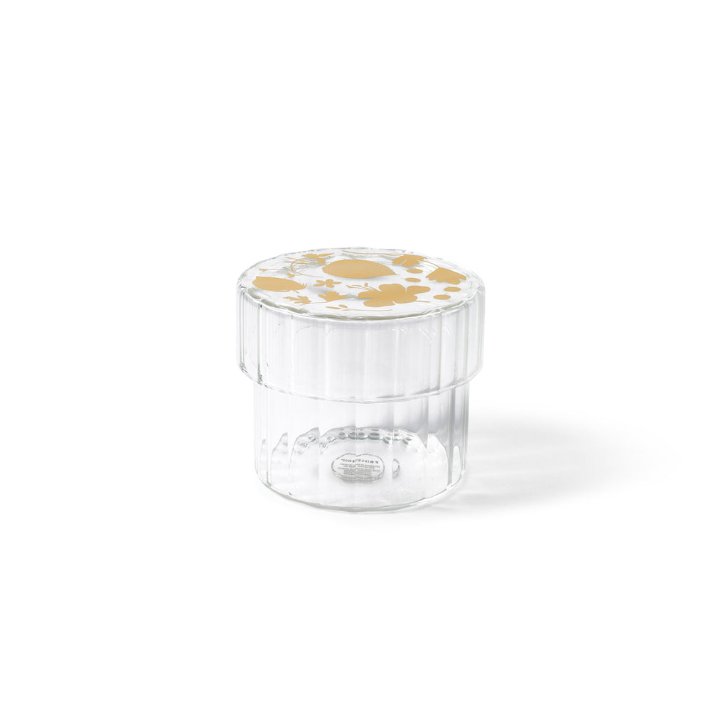 Clear fluted borosilicate glass trinket box featuring Fringe original artwork, metallic gold decal art, and glass lid. Packaged in a reusable decorative gift box.