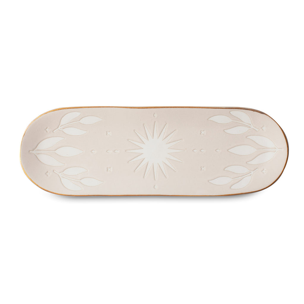 Ceramic pencil tray featuring Fringe original artwork with metallic gold trim, matte cream glaze, and white wax resist design with exposed stoneware base. Packaged in a kraft gift box.