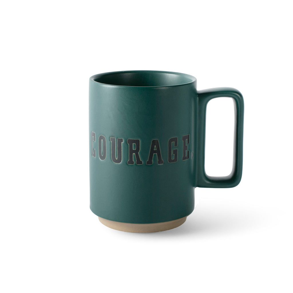 Ceramic mug featuring Fringe original artwork with matte emerald green glaze, charcoal wax resist design, and exposed stoneware base.