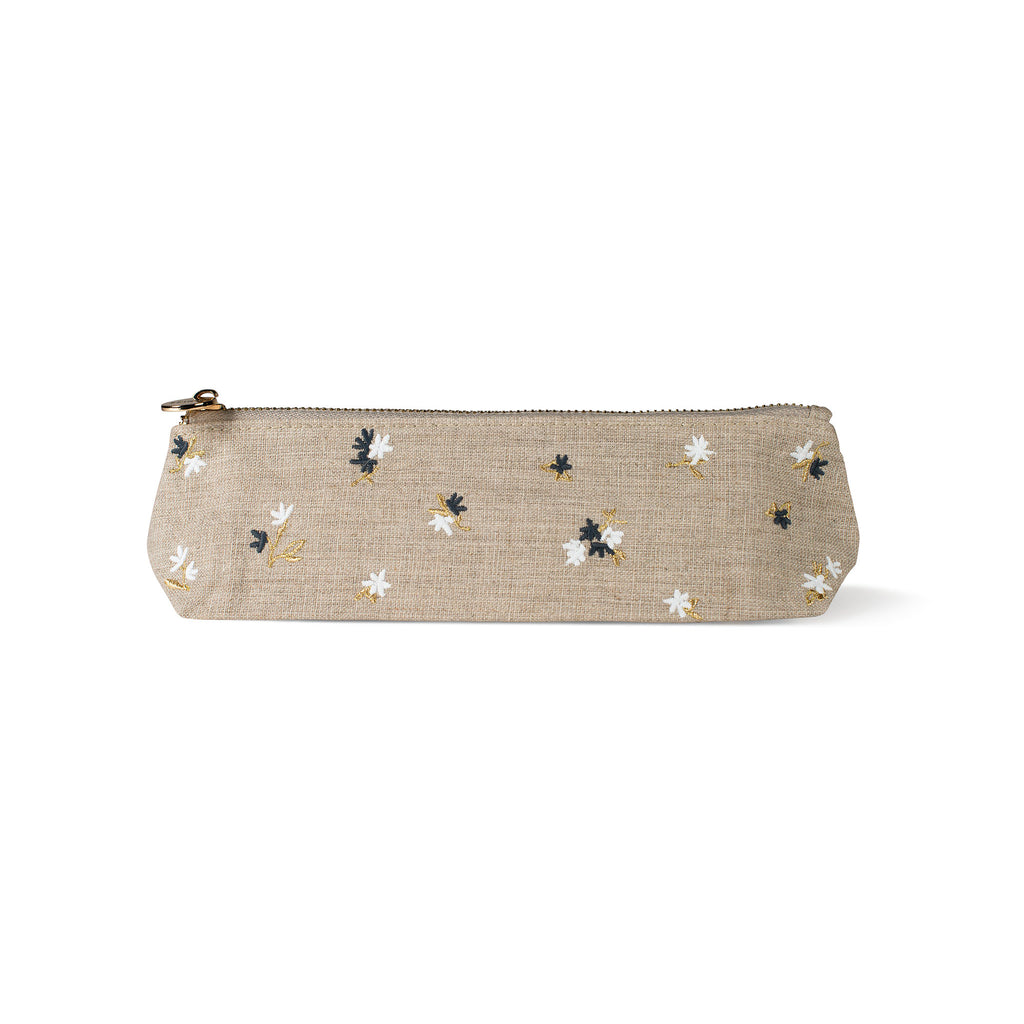Flat bottom linen pencil pouch featuring Fringe original artwork, embroidered design, metallic gold thread accents, a debossed logo charm, and contrasting patterned cotton lining.