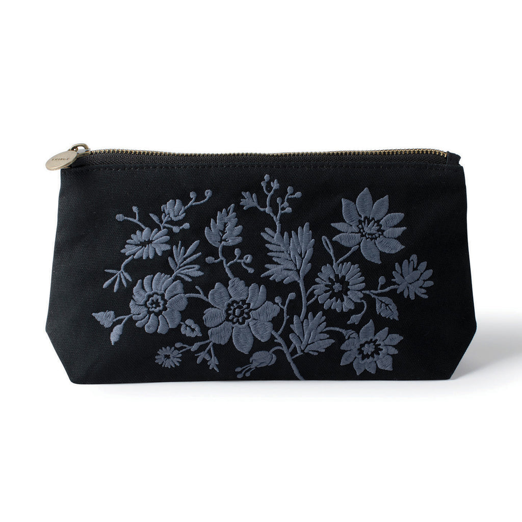 Flat bottom canvas pouch featuring modified antique artwork, embroidered design, a debossed logo charm zipper pull, and contrasting patterned cotton lining. Design pattern placement is random, making each pouch one-of-a-kind.