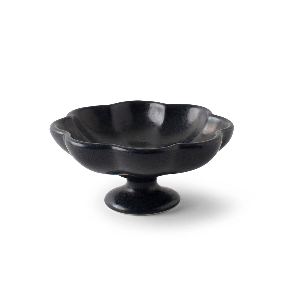 Ceramic trinket dish with semi-matte charcoal reactive glaze, scalloped edges, and pedestal base.