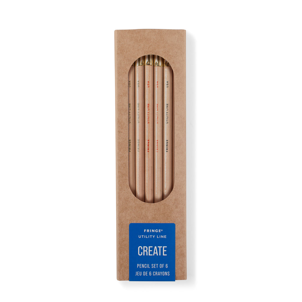 Set of 6 round wooden pencils stamped with colored Utility logo. Includes 2 of each color: red, indigo, and sage. Designed to fit in pencil slots on Utility Desktop Organizer. Packaged in kraft slide box.