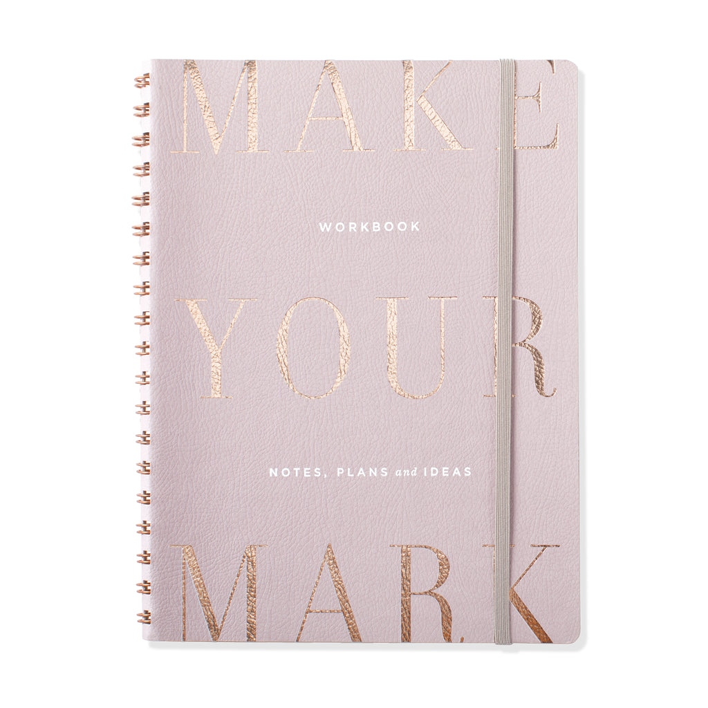 Workbook with faux leather cover featuring Fringe original artwork, metallic rose gold foil design, elastic cord closure, double-sided pocket, and semi-concealed twin-ring spiral binding. Includes 4 tab dividers to separate 4 types of interior pages: dots, grid, lined, and blank.